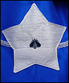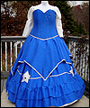 This bridal gown was created for a fantasy wedding. The bride designed her own dress, and I worked from her sketches to make it. I custom dyed all of the dupioni silk that this dress required, except for the accent fabric used for the pockets and jacket sash. It is comprised of 6 pieces- 2 long skirts with ruffles on the bottom (the inner most one is white), one star-shaped ¾ length skirt with silver trim, a white peasant-styled blouse, a steel-boned corset, and a tailed jacket. She wanted it in separate pieces so that she could mix-and-match them later for different events. The entire ensemble is decorated with various colors of Swarovski rhinestones and beads. The jacket has star-shaped pockets, epaulettes, and a large decorative bow in the back. The button holes on the jacket are surrounded by a appliques of comet tails, which are finished when the jacket is closed by the star-shaped buttons down the front. This dress required 55 yards of fabric! |