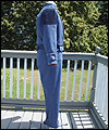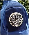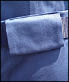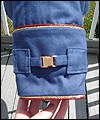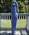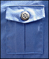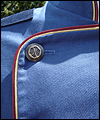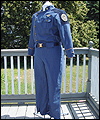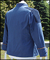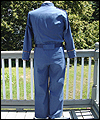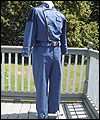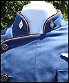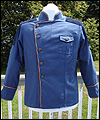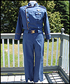 This uniform is a recreation of the character Admiral Adama's costume in the TV show Battlestar Galactica. It is made of polished upholstery cotton, and lined in cotton broadcloth. The red cording is made of leather, which I custom painted. There is also a second row of metallic cording on top of the leather cording. The buttons on this costume were purchased from the same company that provided the buttons for the original TV costumes. The dark accents on the shoulders are made of suede. I custom painted the plastic buckles on the belt and the sleeves. |