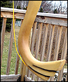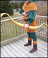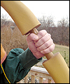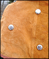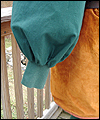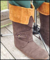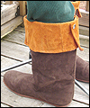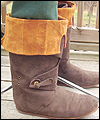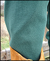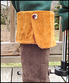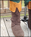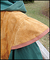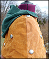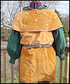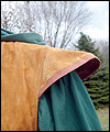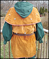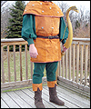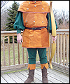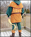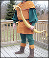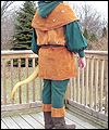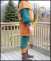 | This costume is a recreation from the 1980’s Dungeons and Dragons cartoon. My friends and I are all fans of the series, and thought it would be a lot of fun to dress as the characters at our local Renaissance Faire. I created all of the costumes, and my good friend Brian Healy created all of the props and weapons. This Hank the Ranger consists of cotton rib knit leggings, a cuff-sleeved cotton shirt with a hood made of rib knit, and a sleeveless tunic and mantle made of suede with large metal studs. The suede pieces are lined in cotton and trimmed with cotton bias. The boots are a pair of inexpensive costume boots that I altered by replacing the side closures with heavy-duty snaps, and sewing a suede upper flap to match the leather tunic. The bow was hand-carved by Brian Healy out of Cyprus wood. The bowstring is made of Livewire, which glows yellow at the flip of a switch! |