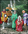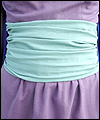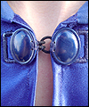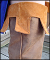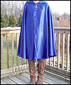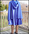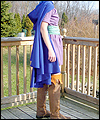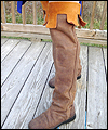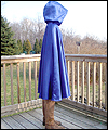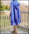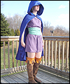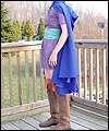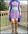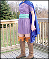 | This costume is a recreation from the 1980’s Dungeons and Dragons cartoon. My friends and I are all fans of the series, and thought it would be a lot of fun to dress as the characters at our local Renaissance Faire. I created all of the costumes, and my good friend Brian Healy created all of the props and weapons. This Sheila costume has a silk noil dress with cuffed short sleeves. I self-lined the dress to prevent a visual hemline from showing on the bottom of the skirt. The sash is made of linen, and laces up the back. I made the cloak from crepe-backed satin, and lined the hood in cotton. This fabric hangs beautifully, and has just the right amount of sparkle to portray the “magic” aspect of her cloak. I made the thigh high boots by sewing leather into a boot spat that fit perfectly over a pair of loafers. I then glued the spat permanently to the under shoes, and hand stitched around the entire lower edge for a finished look. The castle tops on the upper edge of the boots are made of suede. |