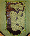 | I made this bag as a gift for one of my favorite musicians, Heather Alexander. (Please check out her website in my links section!) It is made from raw silk with leather appliqué work and glass beads. The lining is cotton. All of the appliqués and beads were applied by hand, as were the Swarovski rhinestones in the background section of the center panel. I also made the leather button for the flap closure. |