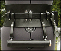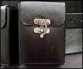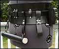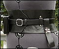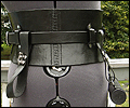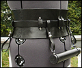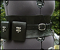 This wide belt was created for a LARPer who wanted a female kidney belt that would hold all of her necessities at her game. It is made of 7-9 oz. veg tanned leather, and has a thinner buckled belt that holds it in place. I molded the wide belt over a plaster corset mold to give it its hourglass shape. It has 2 pouches, 2 weapon or mug straps, and a leather map/scroll case. All of the accessories are removable, so she can carry what she needs for each event. |