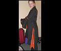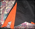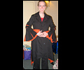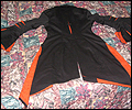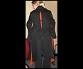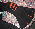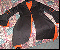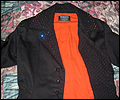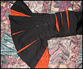 | I gave this coat to Japanese pop star T.M.Revolution at his autograph session when he performed at Pacific Media Expo in Anaheim, CA in 2004. It took me many hours to complete, and it was a bit of an obsession when I was working on it. It’s made of cotton blend twill, with cotton inset panels and a cotton liner. The sleeves are made of 30 pieces of fabric each! The cuffs on the sleeves are alternating black and orange triangular panels, which form a full circle when open. The liner on the inside of the sleeves is orange. There are inset panels on the elbows and back, which open to reveal the orange interior when the wearer moves. All of the orange panels are decorated with orange and red Swarovski rhinestones. There are over 1200 rhinestones, all of which had to be glued on by hand! I hand-stitched the mesh fabric overlay on the collar and inside front facing to keep it in place, and applied more Swarovski rhinestones in “Crystal Volcano” color to make it sparkle. This coat was very heavy when finished- almost 10 pounds! I apologize for the poor quality photos- I did not own a digital camera when I made this coat, and I actually finished sewing it the day before I left for the convention, so all I have is a few pictures I took with my non-digital camera while in my hotel room. |