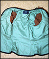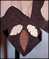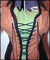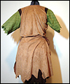| This costume was created for a customer who plays in a Live Action Role Playing game. Her character is an elf, and she requested the color scheme. The fully-lined bodice is made of leather with hand-painted gold details. The under dress and under skirt are suede cloth and cotton with leather leaf details. |
