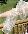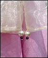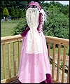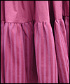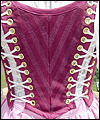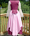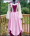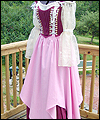 | This costume is one of three that I made for the renaissance faire band Sweet Amaryllis. The ladies in the band wanted coordinating costumes that reflected their own personal style. They chose the color scheme, and gave me an idea of the types of elements that they liked. This costume features a flowing striped jacquard underskirt with a scalloped linen overskirt. The bodice laces on the side front seams, and is made from the same striped jacquard as the underskirt. I cut the front and back sections of the bodice at an angle for visual interest. The body of the shirt is cotton broadcloth, and the sleeves are embroidered organza. The sleeves split up to the elbow for ease of movement. A glass pearl adorns the ends of the sleeves, and the bottom of each scallop on the overskirt. |