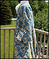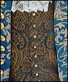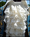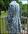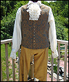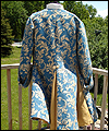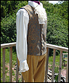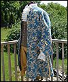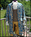 | The customer who ordered this costume wanted a “governor-turned-pirate” sort of look. He wore this costume with a powdered wig and golden eye patch! The coat is made of woven jacquard with a dupioni silk liner in neutral beige. It has working pockets, decorated with buttoned flaps. The vest is heavy tapestry fabric, and I took great care to make both sides, as well as the back of it, symmetrical. The pants are made of ultra suede with silk lining, and the shirt is cotton. The removable jabot consists of six layers of hand-gathered lace, and buttons at the back of the neck. The wrists of the shirt are finished with lace to match the jabot, and button with the same buttons as the coat. |