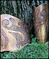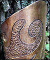 | I made these bracers to sell at my booth at a gaming convention. I wanted to make something that a fantasy character could wear, so I tooled them with a swirling design, and then painted them to look like bronze. This finish was tricky to achieve, and took quite a few layers of colors to get right. |