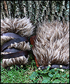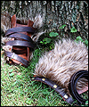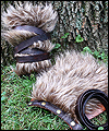 | I made these bracers to sell at my booth at a gaming convention. They are made of leather, with high quality faux fur attached in a strip down the center, and a long leather strap to bind them in place on the wearer's arm. |