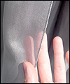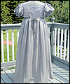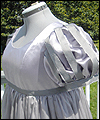 | This bridesmaid dress was made to accompany the Fantasy Wedding Dress in this Gallery. The bride wanted her bridesmaids to represent the four elements- earth, water, air, and fire. She chose the color schemes and fabrics, and provided me with a sketch of her design ideas. The dress is made of crepe-backed satin, and lined in bridal satin. The overskirt is made from iridescent silk chiffon. Satin ribbons decorate the short puffy sleeves, as well as the empire waistline. The satin ribbon at the waistline ties in a bow at the back. This dress is a light lavender color, with a grey iridescent silk chiffon overskirt. The colors are meant to represent a smoky breeze, and thus tie this dress to the elemental theme of Air. |