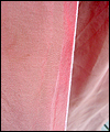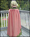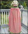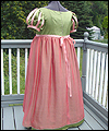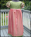 | This bridesmaid dress was made to accompany the Fantasy Wedding Dress in this Gallery. The bride wanted her bridesmaids to represent the four elements- earth, water, air, and fire. She chose the color schemes and fabrics, and provided me with a sketch of her design ideas. The dress is made of crepe-backed satin, and lined in bridal satin. The overskirt is made from iridescent silk chiffon. Satin ribbons decorate the short puffy sleeves, as well as the empire waistline. The satin ribbon at the waistline ties in a bow at the back. This dress is a moss green color, with a pink/green iridescent silk chiffon overskirt. The colors are meant to represent a flower, and thus tie this dress to the elemental theme of Earth. |
