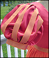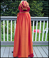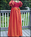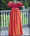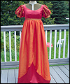| This bridesmaid dress was made to accompany the Fantasy Wedding Dress in this Gallery. The bride wanted her bridesmaids to represent the four elements- earth, water, air, and fire. She chose the color schemes and fabrics, and provided me with a sketch of her design ideas. The dress is made of crepe-backed satin, and lined in bridal satin. The overskirt is made from iridescent silk chiffon. Satin ribbons decorate the short puffy sleeves, as well as the empire waistline. The satin ribbon at the waistline ties in a bow at the back. This dress is a dark red color, with an orange/red iridescent silk chiffon overskirt. The colors are meant to represent a flame, and thus tie this dress to the elemental theme of Fire. |