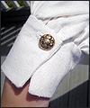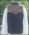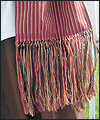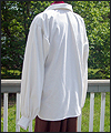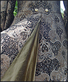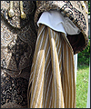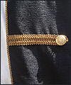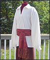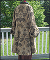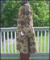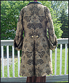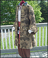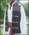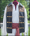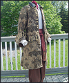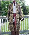 | This costume was created for a LARPer from France. He carefully chose all of the elements for each piece of the costume, and provided me with photos and drawings of his designs and ideas. The costume included a coat, shirt, vest, waist sash, and head scarf. The coat is made of chenille upholstery fabric with an iridescent brown dupioni silk lining. The inset side panels of the coat are also made of dupioni silk, but in a contrasting gold color. The vest is made of velvet, with a cotton twill liner. The vest has functioning side seam pockets, as well as an inside breast pocket. The decorative yoke pieces on the vest are made of satin brocade. The vest is trimmed with a bronze gimp trim, as well as bronze cording at the edges. The waist sash is made of cotton homespun. I unraveled the ends of the fabric and tied decorative knots in the threads to achieve the finished look on the sash. The shirt is made of silk noil, with button cuffs. The head scarf is made of the same homespun fabric as the sash, but in a different color. |