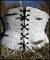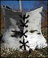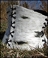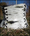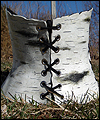 | I made this corset as a custom order for a client who purchased a set of bracers with the same birch bark finish at my booth at a gaming convention. This corset was molded on a plaster corset mold, tooled with the signature horizontal groove pattern of birch bark, and then dyed a dark base color and painted with several layers of lighter colored paint to achieve this finished look. It is finished with a wool felt lining. |