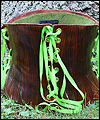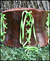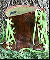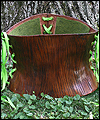 | I made this corset to sell at my booth at a gaming convention. It is made of tooling leather, which I shaped on a plaster corset mold, and then tooled with a wood grain design. After dyeing it brown, I antiqued it with a darker brown stain to fill in the grooves of the tooling, and distress it a bit. Playful green lacing gives it some extra character. Finally, I lined it in wool felt for a softer surface on the inside. |