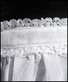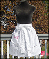 | I made three of these aprons were for a client in Switzerland, who gave them to a special lady in his life. They are meant to be worn with her mini dirndl dress. Each is made from cotton eyelet fabric, and has a pocket with her initials monogrammed onto it. The ties are very long, because they are meant to be crossed in back, and tied in a bow in the front. The pocket and ties are trimmed in lace. My client sent me the specific measurements that he wanted the finished aprons to be, and I followed his instructions to achieve the finished product. |