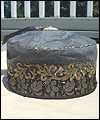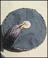 | This hat was made to accompany the Dumbledore costume featured in my Gallery. It is made of custom-dyed cotton jacquard. Two layers of wide trim decorate the band, as well as hand-sewn glass rhinestones and glass bugle beads. The top features a fancy medallion with two tassels. I hand-painted the bead cones on the tassels with gold dye, and hand-made the tassels to fit the bead cones. |