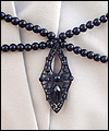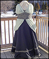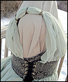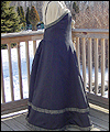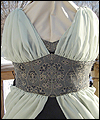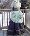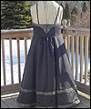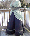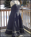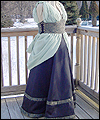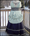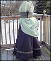 | I was commissioned to make this gown for a lady attending an Edwardian Ball. She designed her own costume, and I created this dress from her sketch. It consists of two pieces- the under dress, and the bustled dress worn on top. The under dress is made of bridal satin, and trimmed with an antique-looking floral jacquard. The jacquard matches the vest that her date wore (also displayed in this Gallery). The trim on the top of the dress is finished with a hand-made satin cording, and has a unique shape on the back. I put extra care into making all of the trim pieces symmetrical. The back panel of the skirt is gathered to make it more like a bustled dress from the time period. The trim on the bottom of the dress was carefully box-pleated by hand, which was quite an undertaking! The over dress is made of a wide boned belt of the same jacquard as the trim on the under dress, and chiffon in a pale green color. The bustle is made of two layers of chiffon, which was carefully pleated and attached to the belt. A string of glass pearls and a decorative hanging pendant adorn the back of the gathered chiffon straps. |