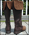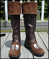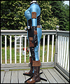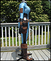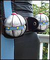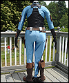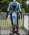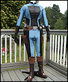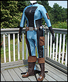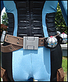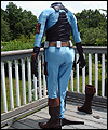 This costume is a recreation of a character from a Star Wars video game. The bodysuit is made of spandex, which I custom dyed to achieve the correct color. I created the front and back chest padding by layering spacer spandex underneath the faux leather spandex panels, and stitching everything in place to hold it. The pockets on the gloves, upper arms, and outer thighs are made of Ultrasuede. I altered the boots by adding Ultrasuede caps onto the toes, and also by adding cuffs. The silver accents on the top of the boots are made of leather. The belt is made of cotton webbing, which I custom dyed. I created the belt boxes and the belt buckle out of cast resin. The bombs are made of epoxy resin over a foam base. I embedded super strong magnets into the bombs to hold them in place on the leather belt holsters. |