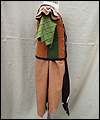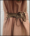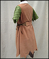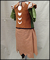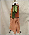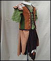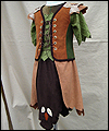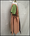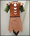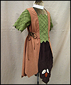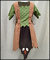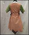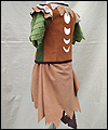 | The client who ordered this costume wanted me to recreate the adult wood elf costume in my gallery into a child's size for her little girl. In order to keep it washable, I made the bodice out of cotton corduroy and textured cotton twill, with a cotton twill lining. The bodice also features suede cloth accents at the shoulders and leaf shaped ones along the back of the neck, and a moon phases applique on the back. The underdress is made of pin-tucked cotton and suede cloth, and has tabs on the sides with eyelets for lacing. The skirt is made from 4 panels of suede cloth that are shaped like leaves, with leaf appliques on the hems. |