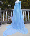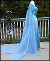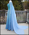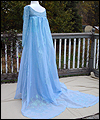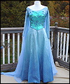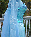 This dress is Elsa's from the movie Frozen. It's made of polyester fabric with silver metallic threads running through it. The bodice of the gown is heavily boned with spring steel boning. I hand-applied more than 1300 hand cut sequins to the bodice. I airbrushed the bottom hem of the gown to give it a gradient effect, and lined the skirt with a blue satin. The cape is made of polyester organza, which I custom dyed and custom stenciled with glitter textile paint. The sleeves are made from glittery sheer spandex which I custom dyed, and decorated with white glittery textile paint. |