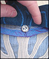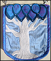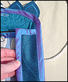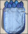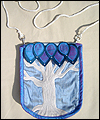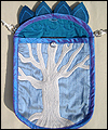 | This bag is one of four, which I made to display in the art show at Lunacon 2009. I wanted my bags to be functional, yet still individual pieces of art. In other words, I wanted people to notice the picture first, and the bag second. This bag is another take on the “Summer Tree Bag”, but sewn with non-traditional colors to give it an ethereal feel. The dupioni silk background represents a rain shower, with which the light gray wool used for the tree trunk contrasts nicely. I stitched the wood grain of the trunk with blue thread to tie the color scheme together. The leaves of the tree are made of iridescent silk, which was appliquéd onto a deep aqua blue wool background. Each leaf is accented with a Swarovski crystal rhinestone. The side gusset is made of the same wool as the leaves, and finished with a scrolling wave design for visual interest. All of the bias tape was made by hand, and the bag fastens with a hidden rhinestone button located under the leaves. The bag is finished with a cotton lining, which matches the aqua wool nicely. |