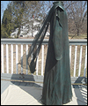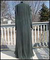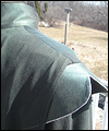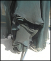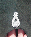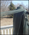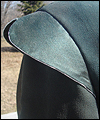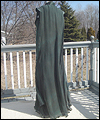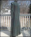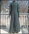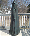 | This elegant robe was made for a client's handfasting ceremony. It is made of 6 layers of silk chiffon in ever-lessening weights from the heaviest innermost layer, to the outside gauze-weight layers. In addition, it has two cape layers made of the lightest weight silk gauze available to me. The sleeves, shoulder caps, and collar are made of sand-washed sueded silk charmeuse. Even though each layer is translucent by itself, the overall garment is opaque due to the number of layers. I custom-dyed the fabric in a mottled dark moss green to represent my client's deity, the Goddess Hekate. The edges of the shoulder caps are adorned with a small silver trim, which was hand-attached with invisible thread. The silk chiffon over-sleeves are decorated with a custom-digitized silver embroidery, and further embellished with sterling silver beads. |