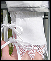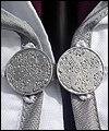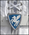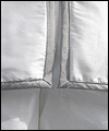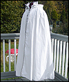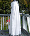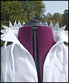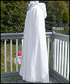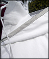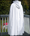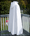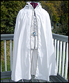 | This costume is based on the one worn by Vanyel Ashkevron on the covers of Mercedes Lackey’s “Last Herald-Mage” series, which were painted by artist Jody Lee. This client requested this costume for her fiancé to wear at their wedding at a medieval faire. The shirt is made from cotton, with lace trim at the collar and cuffs. The breeches are made from dupioni silk, and lined in cotton twill for support. The jerkin is made from dupioni silk, interlined with needle-punched cotton, and lined in cotton. It is trimmed with hand-made silver silk bias tape. It laces up the front with silver grommets. The belt buckle was hand-sculpted, and then cast in resin and painted. The cloak is made of cotton twill, and lined in cotton. The entire edge of the cloak is trimmed with silk bias tape to match the jerkin. Since my client planned to have her wedding outside at a faire, I made her two seat cushions to protect her dress, and this white silk costume, from getting dirty. The seat cushions are made from upholstery jacquard, and interlined in 2 layers of needle-punched cotton. They easily roll or fold up for carrying in a bag, and have removable shoulder straps for carrying. |