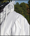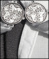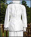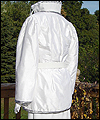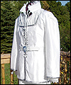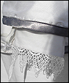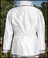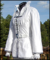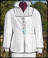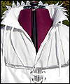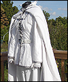 | These costumes are based on the one worn by Vanyel Ashkevron on the covers of Mercedes Lackey’s “Last Herald-Mage” series. My best friend and I are huge fans of the books, and we just had to have these costumes! These versions of the costumes are what we refer to as our “dress whites”, and are fancier than the leather “field whites” listed below. The jerkins are made of silk, lined with cotton, and interlined with needle-punched cotton for warmth. The shirts are cotton, and the breeches are suedecloth. The collar and cuffs are decorated with a fancy lace trim. The belt buckles were hand-sculpted, and then cast in resin and painted. The cloaks are suedecloth lined with flannel, and interlined with heavy wool for warmth. I made all of the satin shantung bias tape trim by hand. We wear these costumes with white hose and calf-high boots. |