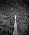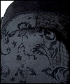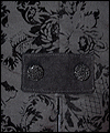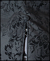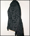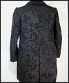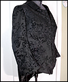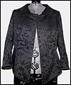 | This coat was a Christmas present for a friend of mine who dresses in the Japanese Elegant Gothic Lolita syle. It is made of black cotton twill with black velvet flocking. I interlined it with a needle-punched cotton quilt liner for warmth and dimension. Its collar and back tab are made of moleskin, and its liner is satin. |