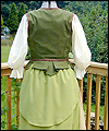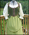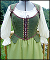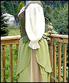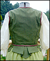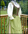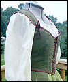 | This costume was created for a lady who sold roses at my local Renaissance faire. She requested the color scheme, and asked that I create an outfit within the acceptable rules for Faire working attire. The shirt is made of textured cotton, and has an elastic neckline so it can be worn at different levels of modesty. The underskirt is a cotton blend herringbone weave, and the overskirt is a textured cotton blend. I created the different tiers of the overskirt to represent the leaves on a rose. The bodice is made of a textured green denim, and finished with cotton bias tape. The tabs on the bodice serve two purposes- they help cover the gap between the skirt and the shirt that often occurs with period clothing, and they make the bodice more comfortable by preventing it from digging into the waist. The hat is made from the same herringbone fabric as the underskirt, and lined with satin. |