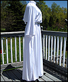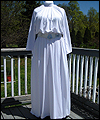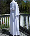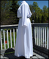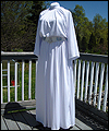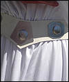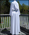 This is a reproduction of Princess Leia's classic costume from Star Wars. It's made of Jet Set knit, and is self lined. There is an elasticized waist channel under the belt, to help everything stay in place. The belt is made of leather, with aluminum accent plates, and metal buttons. It fastens with large snaps that are hidden under one of the plates. I also made removable hair buns to match her iconic hairstyle in the movie. They're made of synthetic hair, which I straightened before I attached it to molded buckrum base pieces. |