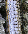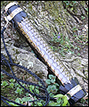 | I sold this map/scroll tube at a gaming convention. It is covered in metallic silver/black alligator-embossed leather over a plastic PVC base tube. The top and bottom are finished with black leather, and more metallic leather supports the rings that hold the removable braided waxed cotton cord strap. It measures about 12 inches long with a 1 1/4 inch diameter opening. |