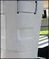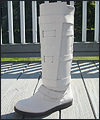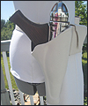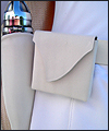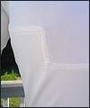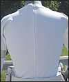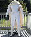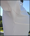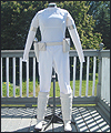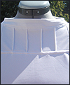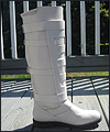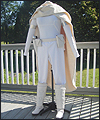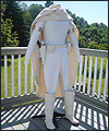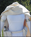 This costume is a reproduction of Padme's outfit from the arena scene in Star Wars Episode 2. The pants and shirt are made of spandex, and feature an inset pintucked panel on the upper chest of the shirt, and unusual seaming details. The cloak is made of upholstery chenille, and the shin guards over the boots are made of leather. I sculpted the gun holster from sculptor's resin, and lined it with spandex so that it would not scratch the gun. The belt and belt pouches are made of leather, and the pouches have hidden magnetic closures. The arm bands are made of aluminum plates, which I affixed to a wide elastic base. |