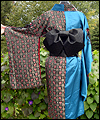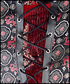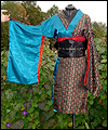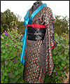 | This kimono is a “punk” version of a traditional Japanese style. It is made of satin in two contrasting colors, with a black cotton sleeveless underkimono. The sleeves are lined with red satin. The red metallic netting inserts that run along the tops of the sleeves have faux leather trim with eyelets for lacing. The obi is a clip-on two-piece style in which the waistband is first wrapped twice around the waist and tied, and then the bow is attached with a hook that slips behind the waistband. |