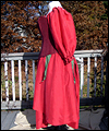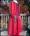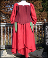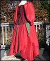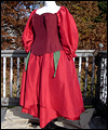 This dress was one of 6 that I created as bridesmaids' dresses for a fantasy wedding. Each bridesmaid represented a different flower. The bride designed the dresses, and I worked from her sketches. This skirt of this ensemble resembles a rose. It is made of custom-dyed dupioni silk, and also features a steel-boned corset, and a long-sleeved peasant shirt. |