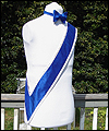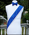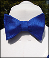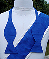 | These bow ties and groom sashes were created for a wedding. My clients chose the fabrics and colors, and I made the sashes and bow ties according to their measurements. They are made of beautiful dupioni silk, with dupioni silk bias trim. They are self-lined with the same fabric. The bow ties are adjustable via sliding buckles on the bands. |