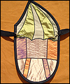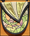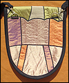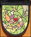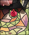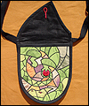 | This bag depicts a dragon sleeping on a bed of treasure. The flap represents the dragon's wing. The bag is made of dupioni silk, which was cut into many pieces in order to resemble stained glass. The dragons claw curls around a gemstone button, which holds the bag closed. This bag was a lot of work, and I was a bit misty-eyed when it sold! |