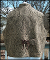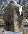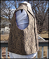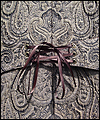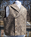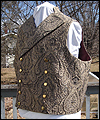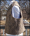 | This vest is one of several that I made for a client who wanted a Steampunk twist on formal wear. He designed the overall look, and chose the fabrics, and I created the pattern based on his ideas. This vest is made of polyester matelasse fabric, with a duchess satin lining. It is double-breasted, and has a welted pocket to hold a pocket watch. It has a stand collar, large lapels, and unique laced tabs on the back. |