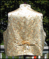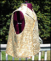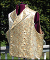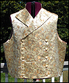 | This vest is one of several that I made for a client who wanted a Steampunk twist on formal wear. He designed the overall look, and chose the fabrics, and I created the pattern based on his ideas. This vest is made of polyester brocade fabric, with a satin lining. It is double-breasted, and has a welted pocket to hold a pocket watch. It has a stand collar, large lapels, and unique laced tabs on the back. |
