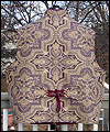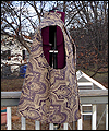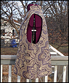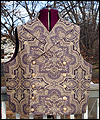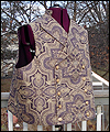 | This vest is one of several that I made for a client who wanted a Steampunk twist on formal wear. He designed the overall look, and chose the fabrics, and I created the pattern based on his ideas. This vest is made of polyester jacquard fabric, with a duchess satin lining. I carefully matched the pattern on both sides of the vest to make it symmetrical. It is double-breasted, and has a welted pocket to hold a pocket watch. It has a stand collar, large lapels, and unique laced tabs on the back. |