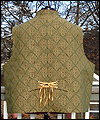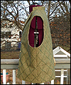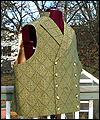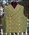| This vest is one of several that I made for a client who wanted a Steampunk twist on formal wear. He designed the overall look, and chose the fabrics, and I created the pattern based on his ideas. This vest is made of polyester jacquard fabric, with a duchess satin lining. I carefully matched the pattern on both sides of the vest to make it symmetrical. It is double-breasted, and has a welted pocket to hold a pocket watch. It has a stand collar, large lapels, and unique laced tabs on the back. |