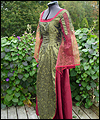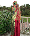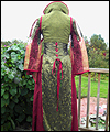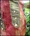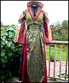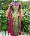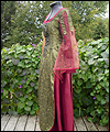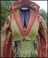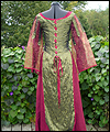 | This Elven dress was my Halloween costume two years ago, but I have since worn it at my local renaissance faire as well. I made it in several layers, which can be worn separately or together, depending on the temperature that it will be worn in. The red underdress is made of silk, and laces up the back. I also have a red skirt of the same silk that can be worn in place of the underdress in hot weather. The embroidery on the satin of the outerdress, as well as the organza sleeves, is the same design. This was a lucky coincidence, since I bought the two fabrics at different stores! The outer sleeves are finished with strips of the satin from the body of the outerdress and gold studs. The short bodice is made of wool felt, and closes with laces on the sides. The collar is decorated with an overlay of the transparent sleeve fabric, and can be worn either up or down. |