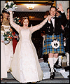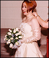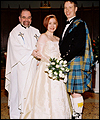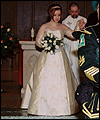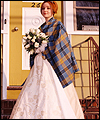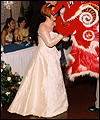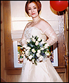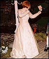 | I made this wedding dress for a good friend of mine after she and her fiancée flattered me into sewing it. (I was quite nervous about making a wedding dress!) It took me months to complete, and was a valuable learning experience for me. The front panel is made of tapestry fabric decorated with an Art Nouveau William Morris Rose design. I bought the fabric while on vacation in Ireland, and lugged it home in my suitcase. I quickly learned that tapestry fabric is quite heavy! The body of the dress is Dupioni silk, and the sleeves are organza. I made all of the cording between the seams from the silk dress fabric. Since the dress has no shoulder support to help carry its weight, I heavily boned the bodice with an inter-liner for invisible structure and support. The inter-liner is located between the outer dress fabric and the liner, and has casings to hold the boning for the bodice to prevent visible seams on the outside of the dress. The entire wedding dress is lined with crepe-backed satin. All of the Swarovski lead-crystal pearls and rhinestones on the front panel were applied by hand. This dress was my first attempt at hand beading, and I am very happy with the end results. |