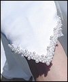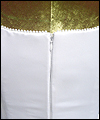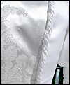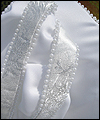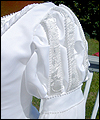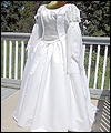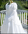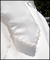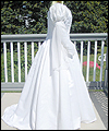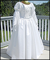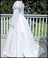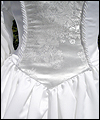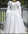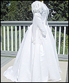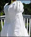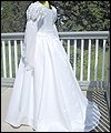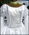 | The client who commissioned this wanted her wedding dress to resemble a fairy tale princess. I fashioned the dress after her own sketches that she provided me with. It is made from heavy weight bridal satin, with a front bodice panel of white and silver brocade. A wide cording separates the two fabrics of the bodice. The upper arms are decorated with brocade “ribbons”, which are trimmed in pearls. The over-sleeves are made from silk chiffon. Fancy pearl trim embellishes the pointed wrists of the under-sleeves. The dress is lined with bridal satin, and the bodice is underlined with two layers of heavy canvas, which is boned with steel boning for support. A pearl trim runs around the neck opening for an extra hint of elegance. |