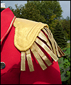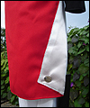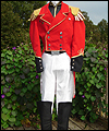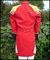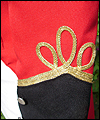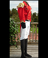 I made this costume for myself to wear at an anime convention. It is a recreation of the uniform worn by Zechs Merquise in the anime Gundam Wing. The coat is made of polyester, which resists wrinkles and hangs beautifully. I created the epaulettes on the shoulders from an inner layer of wool felt with piping details, and covered them with gold quilter’s lame. I hand-stitched all of the gold ribbon details onto the epaulettes. I made the belt buckle from aluminum bracelet blanks, which I cut with tin snips and glued together. The boots are actually spats made of stretch vinyl that meet the under boot at the ankle. They have wires inserted into the upper flaps to keep them rigid. The pants are a stretch cotton twill, and the under shirt is polyester. |