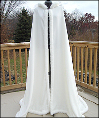 I was commissioned to make this cloak for a winter wedding. It features faux fur trim and a detachable hood. It is made of crepe with a satin liner. It reaches the floor in the front, and has a flowing train in the back. The bride planned to wear it down the aisle, so I felt it had to match her beautiful dress in quality. She used the cloak without the hood while wearing her veil, and then attached the hood for pictures outdoors. This cloak was created as a set with the bridal muff also in this gallery. |