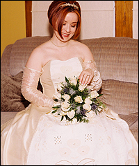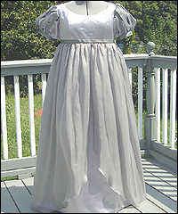 This bridesmaid dress was made to accompany the Fantasy Wedding Dress in this Gallery. The bride wanted her bridesmaids to represent the four elements- earth, water, air, and fire. She chose the color schemes and fabrics, and provided me with a sketch of her design ideas. The dress is made of crepe-backed satin, and lined in bridal satin. The overskirt is made from iridescent silk chiffon. Satin ribbons decorate the short puffy sleeves, as well as the empire waistline. The satin ribbon at the waistline ties in a bow at the back. This dress is a light lavender color, with a grey iridescent silk chiffon overskirt. The colors are meant to represent a smoky breeze, and thus tie this dress to the elemental theme of Air. |