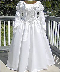 The client who commissioned this wanted her wedding dress to resemble a fairy tale princess. I fashioned the dress after her own sketches that she provided me with. It is made from heavy weight bridal satin, with a front bodice panel of white and silver brocade. A wide cording separates the two fabrics of the bodice. The upper arms are decorated with brocade “ribbons”, which are trimmed in pearls. The over-sleeves are made from silk chiffon. Fancy pearl trim embellishes the pointed wrists of the under-sleeves. The dress is lined with bridal satin, and the bodice is underlined with two layers of heavy canvas, which is boned with steel boning for support. A pearl trim runs around the neck opening for an extra hint of elegance. |