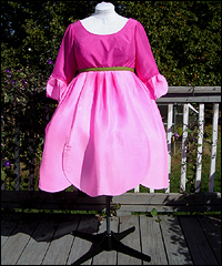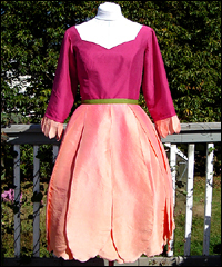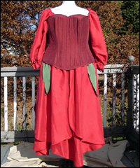 This dress was one of 6 that I created as bridesmaids' dresses for a fantasy wedding. Each bridesmaid represented a different flower. The bride designed the dresses, and I worked from her sketches. This skirt of this ensemble resembles a rose. It is made of custom-dyed dupioni silk, and also features a steel-boned corset, and a long-sleeved peasant shirt. |
