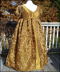 I made this dress for a customer attending a fancy costumed event. She requested the style, and sent several reference pictures of her ideas, and I designed it based on that. It's made of iridescent polyester taffeta, with an iridescent polyester organza skirt overlay, and organza sleeves. I used a bronze colored trim around the under bust to give it an extra layer of detail. |